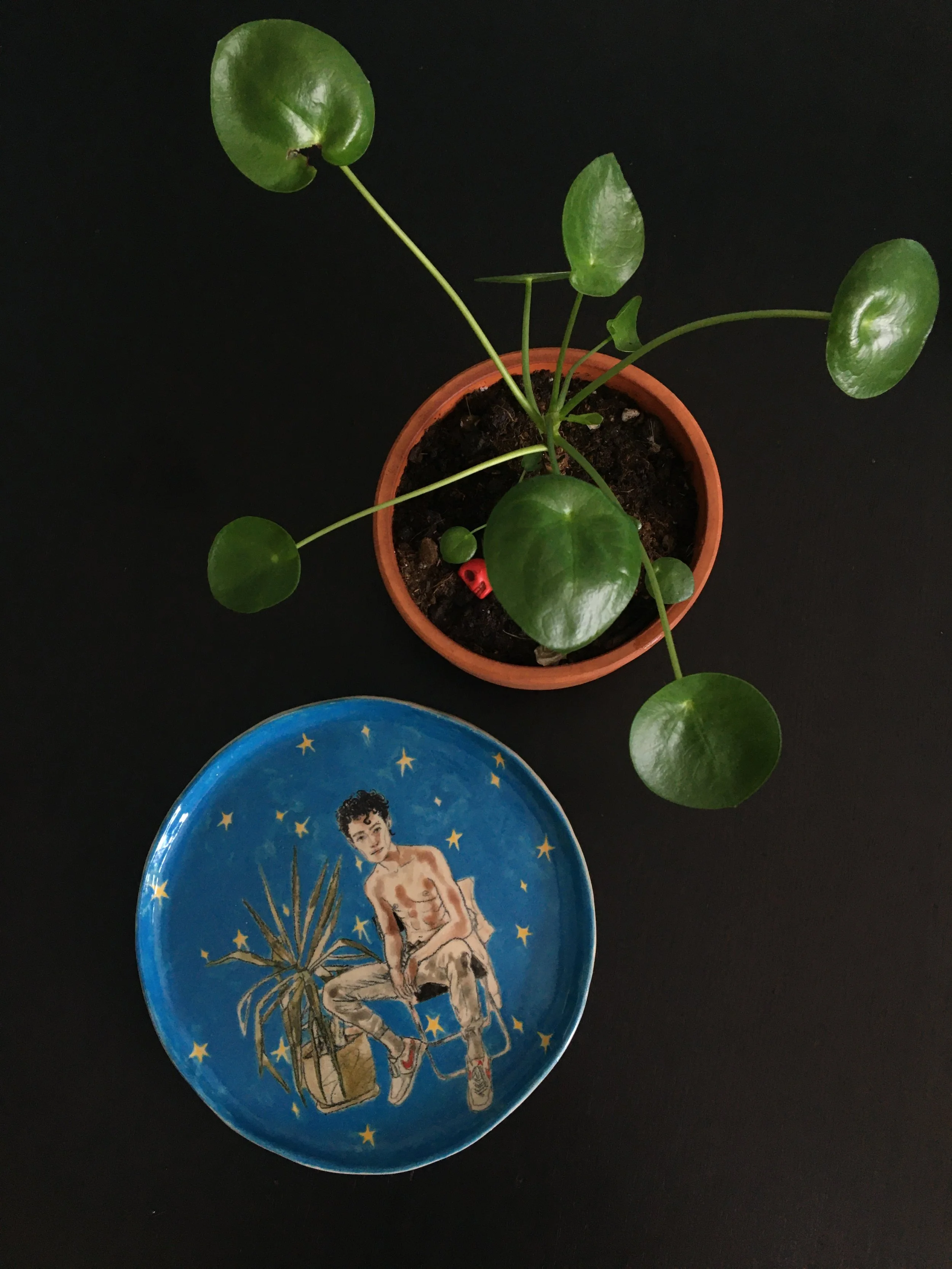 Hermes tired of mischief takes a break to catch back his breath.For a short period of time, I got the pleasure of collaborating with Sevgi Özkan, aka Boiler Room. The young cermaic artists named her brand inspired by her studio which is literally in the boiler room of her apartment. Hermes Plate is one of the first ones I painted over her sculpted ceramic plate. It was challenging yet a very zen experience because, ceramics is art but a chemical process. Unlike painting, you cannot erase or paint over things. Out of 10 pieces, we lost at least 2. A misuse of paint, one celcius hotter oven is enough to break your work apart. The colors always come out darker, muddier. So ceramics, and especially making this piece, I learnt to be patient and accept that I cannot control the outcome of certain things in life.