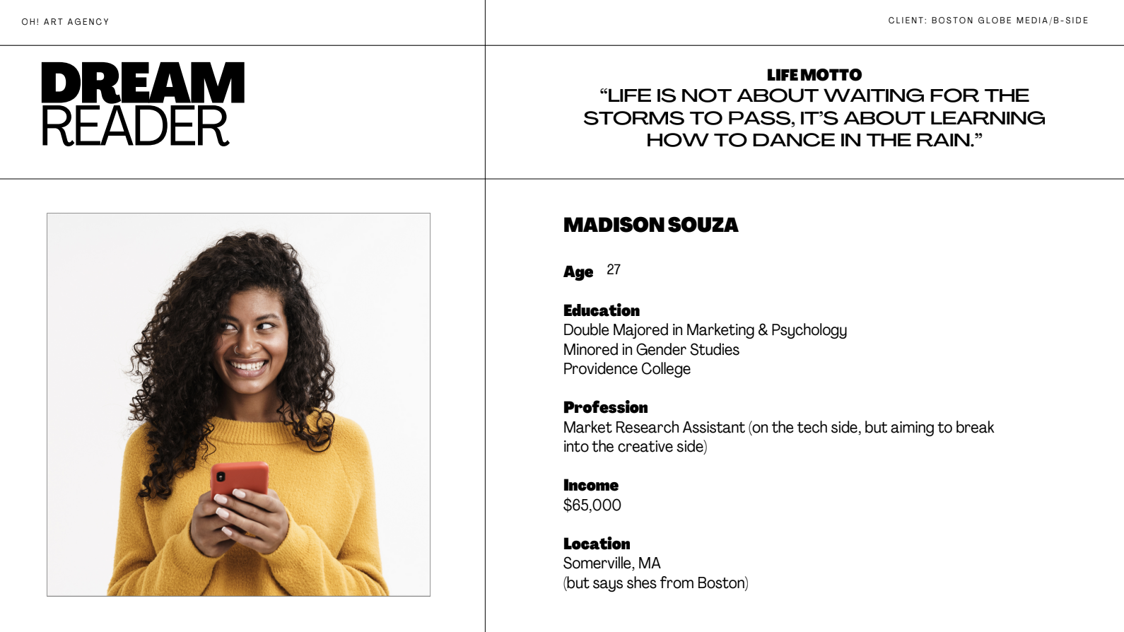 The B-Side is a voicey meme machine, created for the Gen-Z audience. Delivering a fresh take on journalism and spicing up the ouvré of the iconic 150-year-old Boston Globe. With entertaining and relevant vertical content this new channel provides the inside scoop on local happenings and global going-ons across their social channels and daily email newsletter. The product of a Boston Globe hackathon, it’s a novel take on journalism with unapologetic spunk and trending energy.