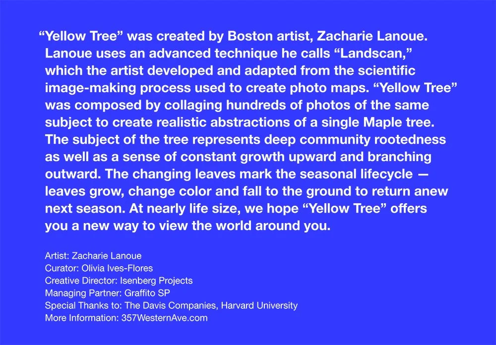 Commissioned by Harvard University, this innovative installation created by artist Zacharie Lanoue, is an early piece in a long-term Harvard-funded initiative to explore how public art can activate Western Avenue. The project could last up to a decade, as more development begins to change the landscape of the neighborhood.